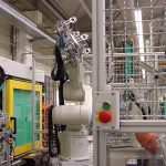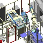 Ein 6-Achs-Roboter mit einer Traglast von 12 kg und einem maximalen Arbeitsbereich von 2.538 mm übernimmt im weiteren Prozess mehrere Aufgaben: das Einlegen der jeweils fünf gebogenen Leiter in das Spritzgusswerkzeug, die Entnahme der im Gehäuse umspritzen Fertigteile, das Einlegen der vier gespritzten Gehäuse in die Hochspannungsteststation, das Entnehmen der geprüften Bauteile sowie deren selektive und lageorientierte Ablage in den Kundentray. Bei einer NIO-Messung erfolgt ein selektiver Ausschleusvorgang in einen separaten NIO-Schacht.