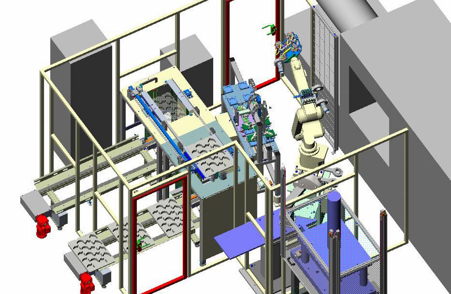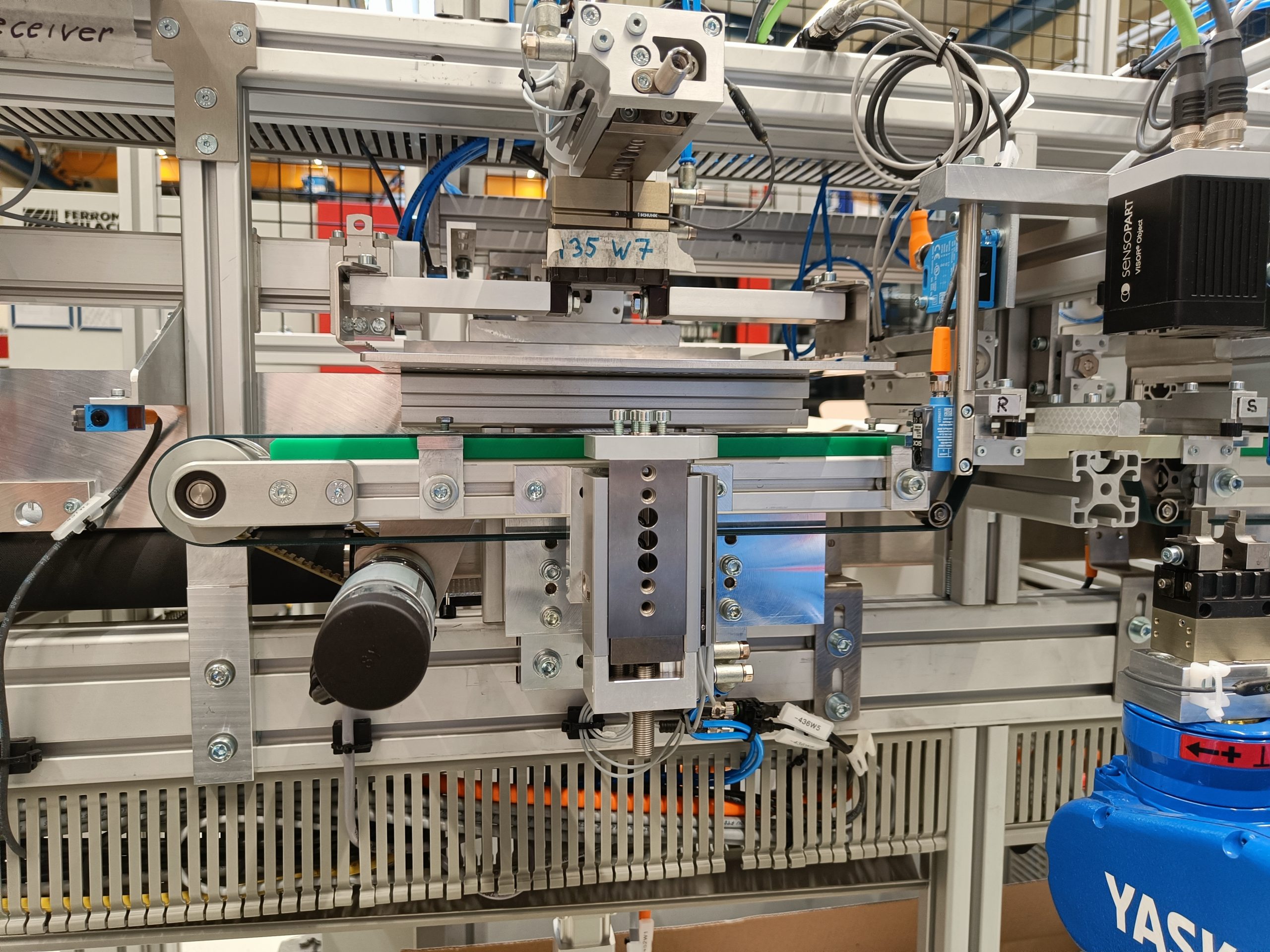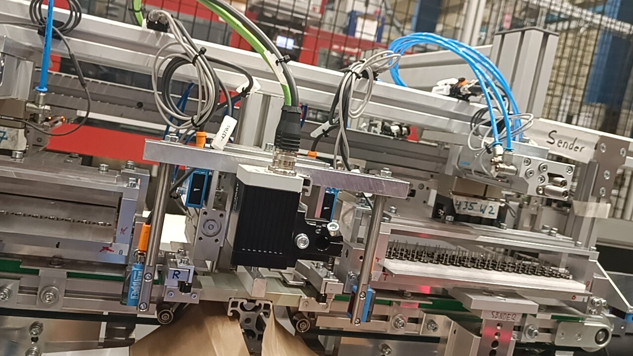 Die Feinblechleiter, ausgeführt als Biege-Stanzteile, sind aufgrund ihrer Eigenschaften nicht aus Schüttgut zuführbar. Zusätzlich ist ein 100%iger Hochspannungstest der umspritzen Leiter erforderlich. Die Fertigung erfolgt auf einer Spritzgießmaschine mit 4-fach-Werkzeug bei einem maximalen Spritzzyklus von 30 Sekunden. Der Auslieferungszustand der Baugruppe ist lageorientiert in einem 12-fach-Kundentray. Darüber hinaus wird eine Anlagenautonomie von vier Stunden im Drei-Schicht-Betrieb gefordert.