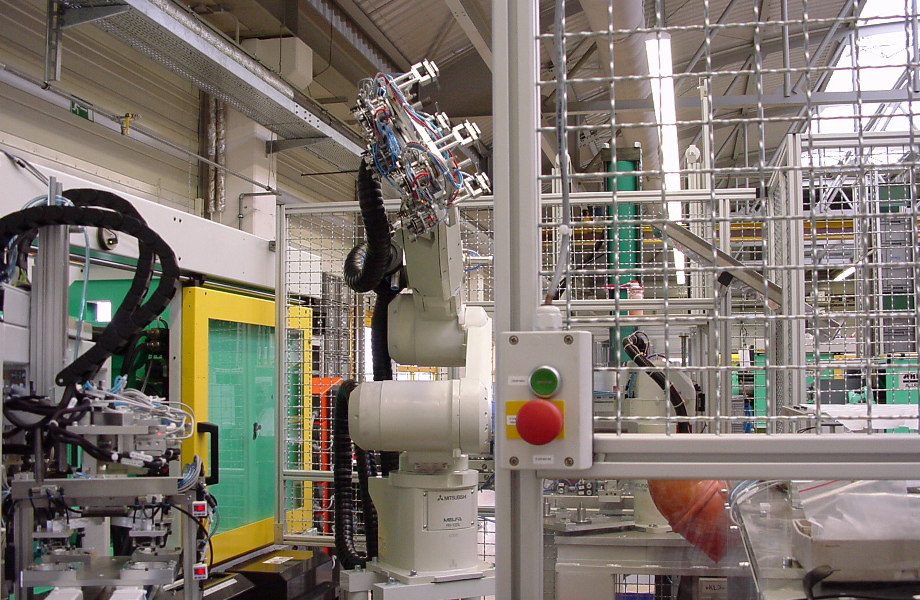Ein 6-Achs-Roboter mit einer Traglast von 12 kg und einem maximalen Arbeitsbereich von 2.538 mm übernimmt im weiteren Prozess mehrere Aufgaben: das Einlegen der jeweils fünf gebogenen Leiter in das Spritzgusswerkzeug, die Entnahme der im Gehäuse umspritzen Fertigteile, das Einlegen der vier gespritzten Gehäuse in die Hochspannungsteststation, das Entnehmen der geprüften Bauteile sowie deren selektive und lageorientierte Ablage in den Kundentray. Bei einer NIO-Messung erfolgt ein selektiver Ausschleusvorgang in einen separaten NIO-Schacht.