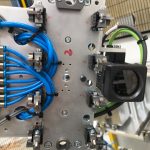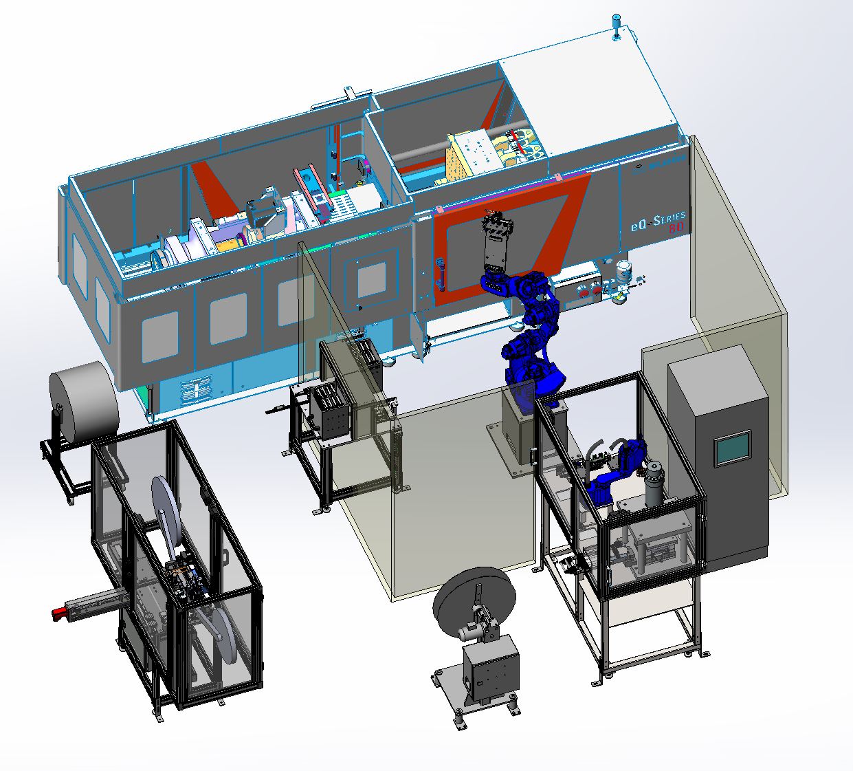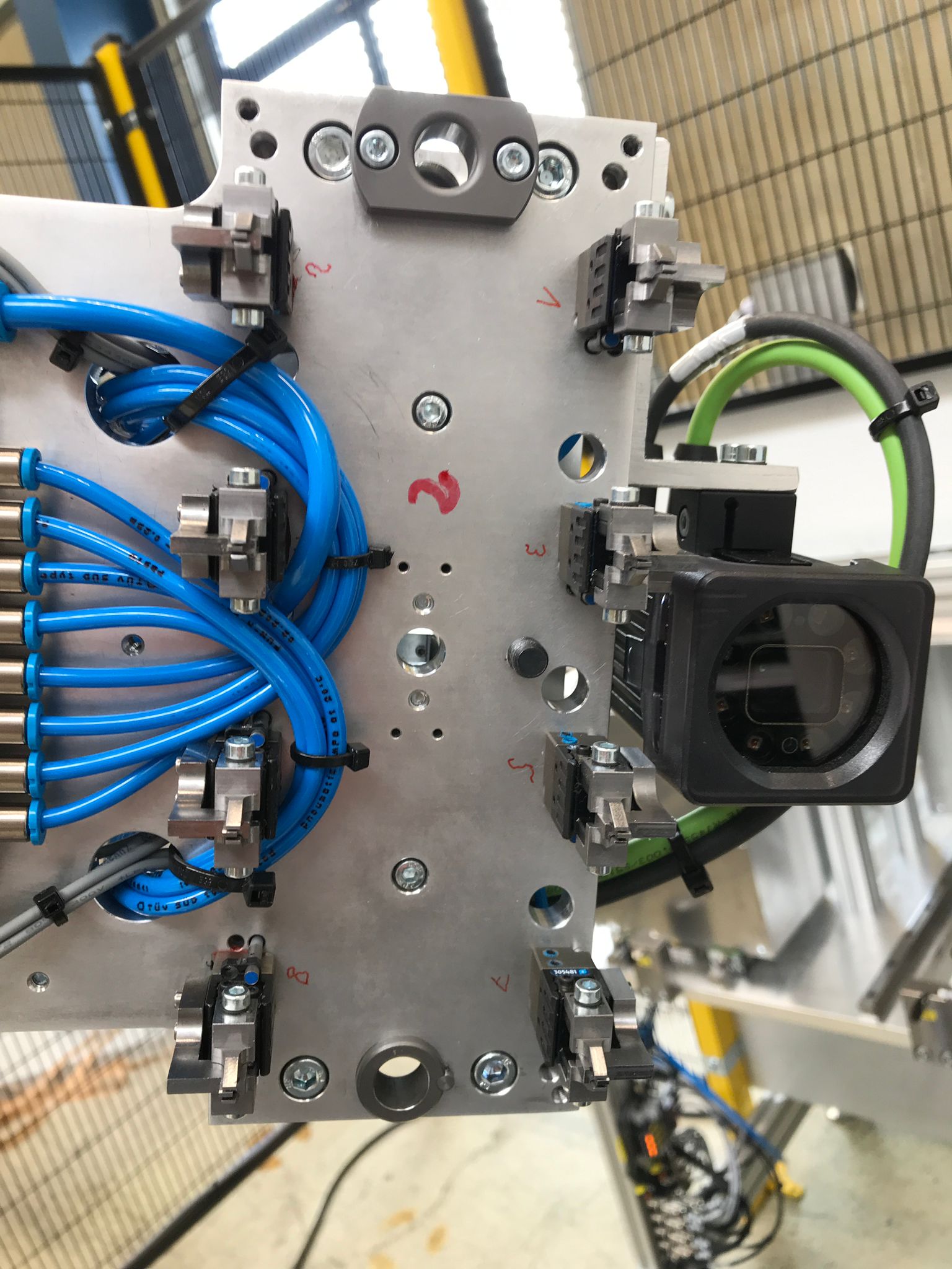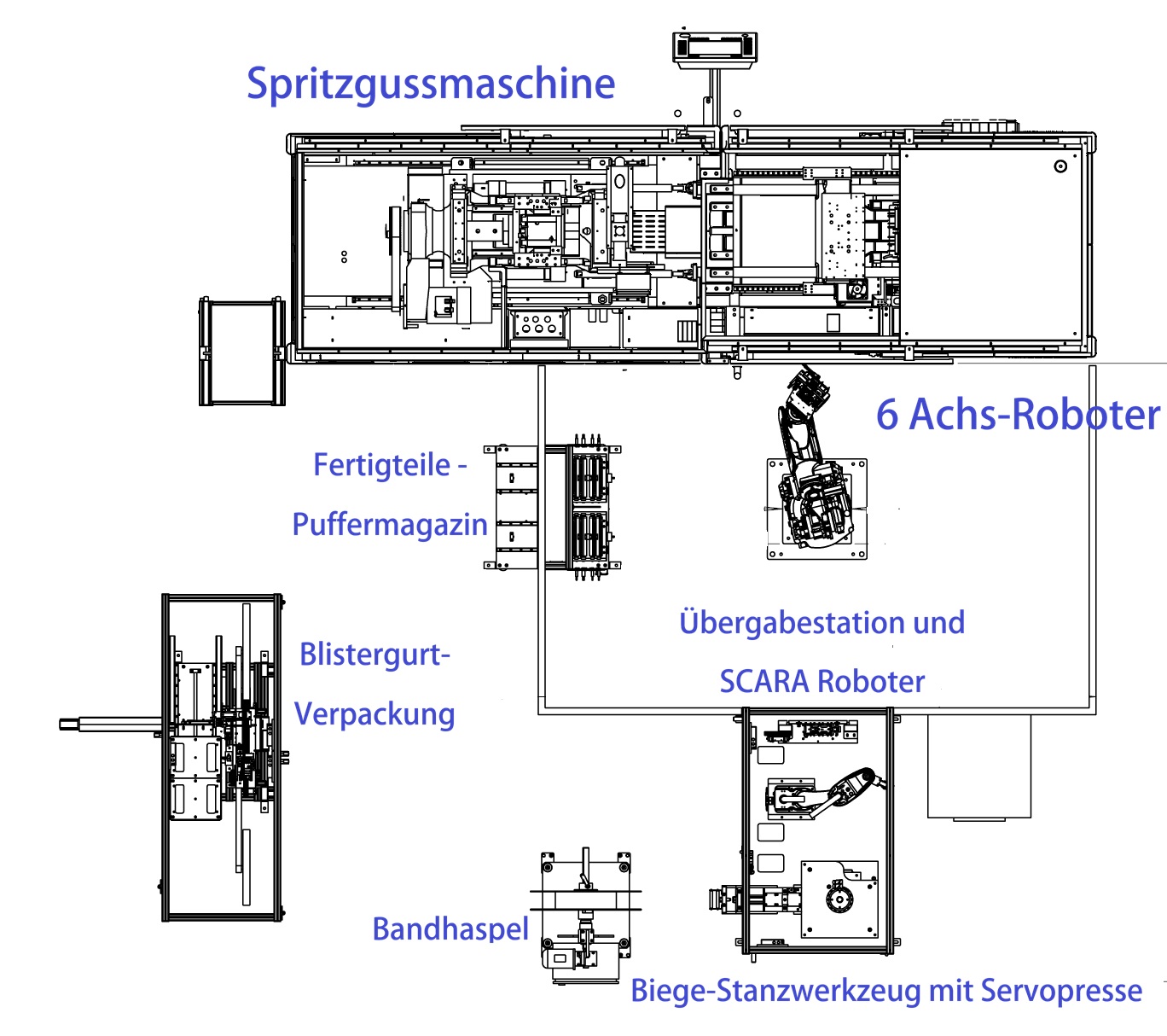 Nach dem Umspritzen werden die fertigen Klemmkontakte zusammen mit der Angussspinne entnommen und in ein speziell entwickeltes Kassettensystem mit Wechselkassetten abgelegt. Dieses Kassettensystem dient als Puffer und ermöglicht eine Autonomiezeit von acht Stunden; ein Kassettenwechsel ist dabei auch im laufenden Betrieb möglich. Zusätzlich ist im Greifer eine Kamera integriert, welche die Teilegeometrie erfasst und die Kavitäten überwacht. Für die abschließende Tape-and-Reel-Gurtung wird eine separate Blistergurtmaschine eingesetzt. Die Teilezufuhr erfolgt über die speziell entwickelten Kassetten mit zusätzlichem Bandpuffer, sodass eine Autonomiezeit von vier Stunden erreicht wird. In die Blistergurtmaschine ist außerdem eine Bildverarbeitung integriert, die eine finale 100%ige Vermessung der Kontakte unmittelbar vor der Blistergurtung sicherstellt.