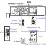 Die Fertigung basiert auf einem 8-fach-Spritzgusswerkzeug bei einem maximalen Spritzzyklus von 25 Sekunden. Das Kontaktpaar besteht aus zwei spiegelbildlich angeordneten Einzelkontakten. Besondere Anforderungen ergeben sich aus den relevanten Funktionsmaßen an den Klemmflächen, die innerhalb eines Toleranzbereichs von kleiner 0,05 mm liegen müssen. Die Einzelkontakte sind aufgrund ihrer geringen Wandstärke von 0,2 mm, ihrer maximalen Abmessungen von 7,5 x 3,0 x 2,1 mm sowie ihrer Teilvergoldung nicht aus Schüttgut zuführbar. Zudem ist eine 100%ige Kontrolle der relevanten Funktionsmaße erforderlich. Der Auslieferungszustand ist eine fertig montierte Baugruppe in Tape-and-Reel-Gurtung. Darüber hinaus wird eine Anlagenautonomie der Spritzgießmaschine von mindestens acht Stunden im Zwei-Schicht-Betrieb gefordert.